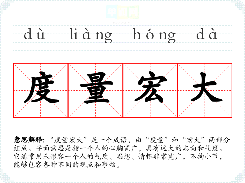 “度量宏大”是一个成语,由“度量”和“宏大”两部分组成。字面意思是指一个人的心胸宽广,具有远大的志向和气度。它通常用来形容一个人的气度、思想、情怀非常宽广,不拘小节,能够包容各种不同的观点和事物。