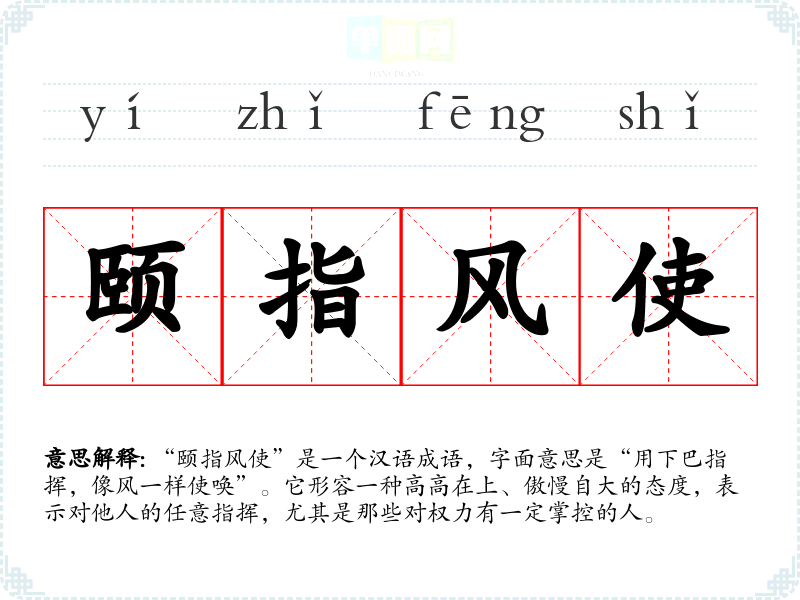 “颐指风使”是一个汉语成语,字面意思是“用下巴指挥,像风一样使唤”。它形容一种高高在上、傲慢自大的态度,表示对他人的任意指挥,尤其是那些对权力有一定掌控的人。