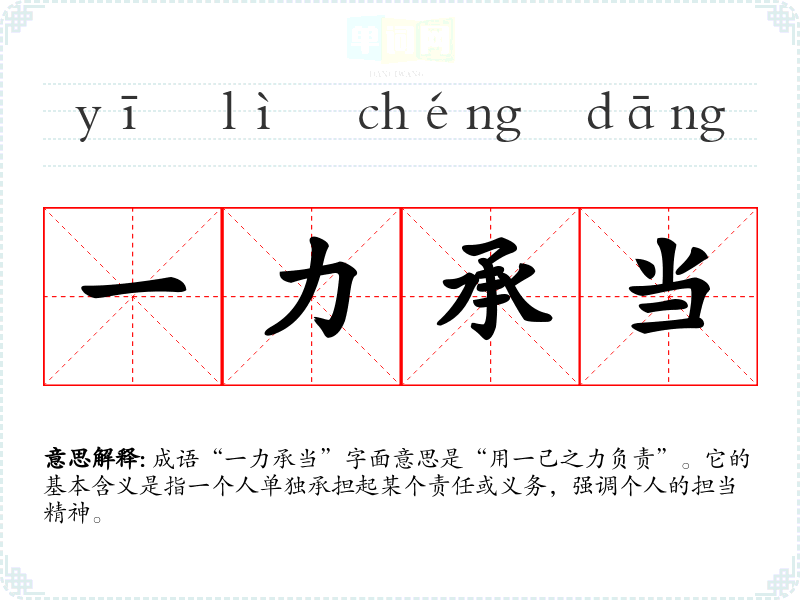 成语“一力承当”字面意思是“用一己之力负责”。它的基本含义是指一个人单独承担起某个责任或义务,强调个人的担当精神。
