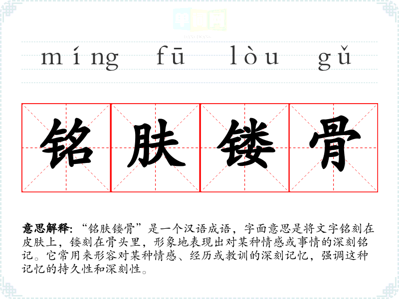 | 铭肤镂骨 | 形容感受极深,永记不忘。同“铭心镂骨”。 |