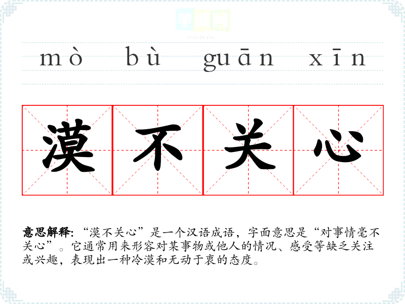 “漠不关心”是一个汉语成语,字面意思是“对事情毫不关心”。它通常用来形容对某事物或他人的情况、感受等缺乏关注或兴趣,表现出一种冷漠和无动于衷的态度。
