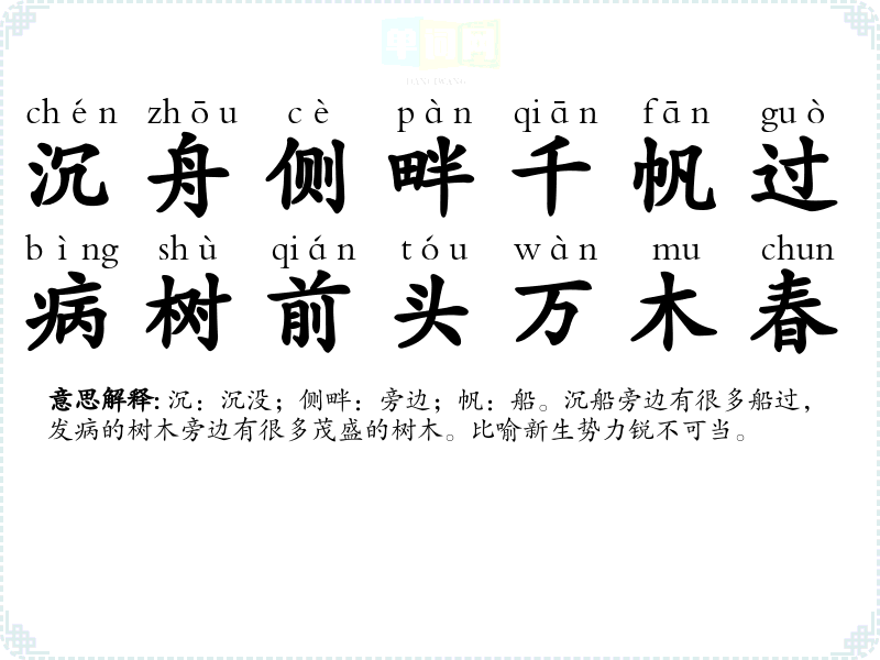 | 沉舟侧畔千帆过,病树前头万木春 | 沉:沉没;侧畔:旁边;帆:船。沉船旁边有很多船过,发病的树木旁边有很多茂盛的树木。比喻新生势力锐不可当。 |