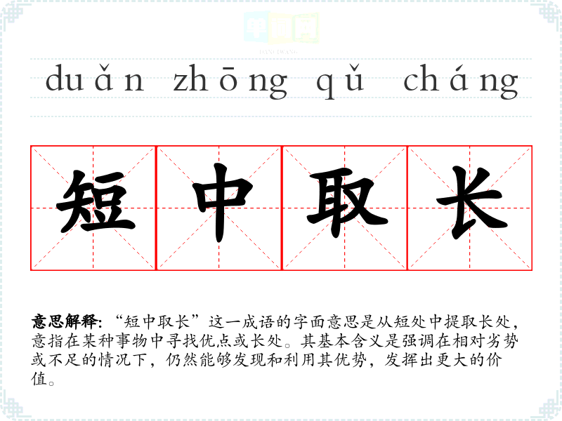 “短中取长”这一成语的字面意思是从短处中提取长处,意指在某种事物中寻找优点或长处。其基本含义是强调在相对劣势或不足的情况下,仍然能够发现和利用其优势,发挥出更大的价值。