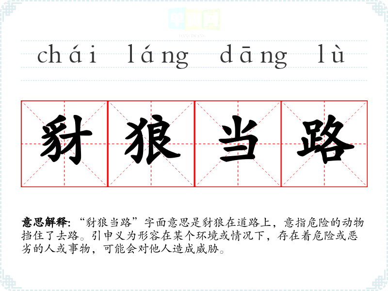 “豺狼当路”字面意思是豺狼在道路上,意指危险的动物挡住了去路。引申义为形容在某个环境或情况下,存在着危险或恶劣的人或事物,可能会对他人造成威胁。