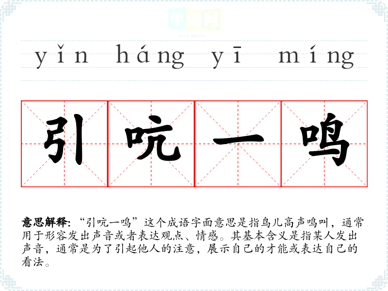 “引吭一鸣”这个成语字面意思是指鸟儿高声鸣叫,通常用于形容发出声音或者表达观点、情感。其基本含义是指某人发出声音,通常是为了引起他人的注意,展示自己的才能或表达自己的看法。