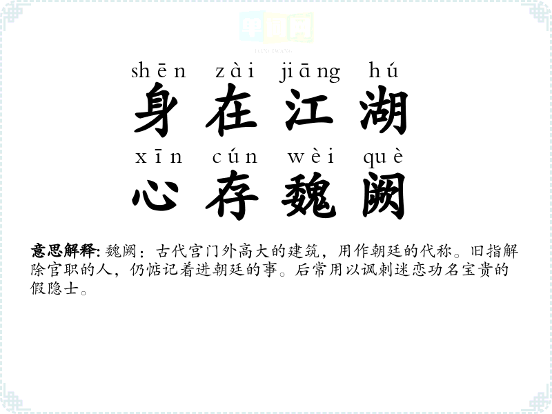 | 心在魏阙 | 指臣民心在朝廷,关心国事。魏阙,古代天子和诸侯宫外的楼观,其下悬布法令,因以代称朝廷。 |