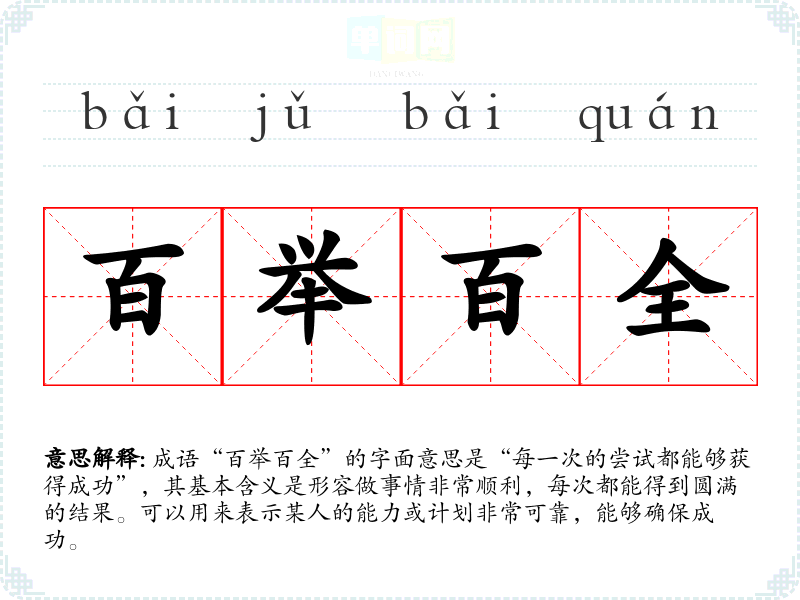“百举百全”常用于描述成功的事情,适用于各种语境: