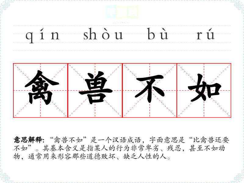 “禽兽不如”是一个汉语成语,字面意思是“比禽兽还要不如”。其基本含义是指某人的行为非常卑劣、残忍,甚至不如动物,通常用来形容那些道德败坏、缺乏人性的人。