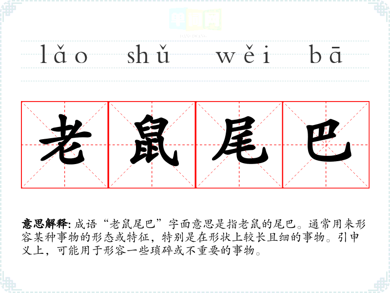 成语“老鼠尾巴”字面意思是指老鼠的尾巴。通常用来形容某种事物的形态或特征,特别是在形状上较长且细的事物。引申义上,可能用于形容一些琐碎或不重要的事物。