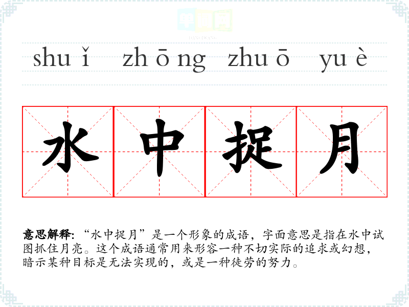 “水中捉月”是一个形象的成语,字面意思是指在水中试图抓住月亮。这个成语通常用来形容一种不切实际的追求或幻想,暗示某种目标是无法实现的,或是一种徒劳的努力。