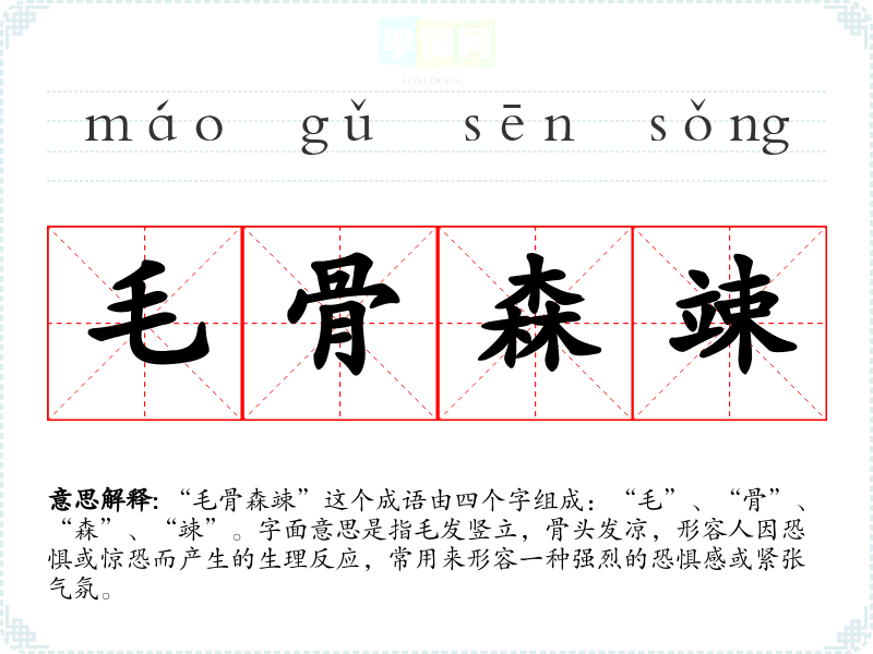 | 毛骨森竦 | 毛:头发和汗毛;骨:脊背。汗毛竖起,脊梁骨发冷。形容非常恐惧。 |