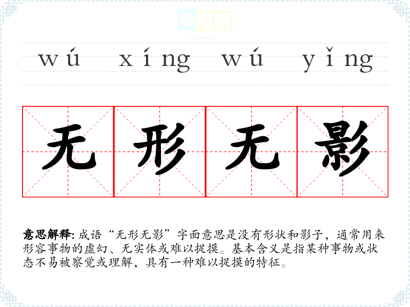 成语“无形无影”字面意思是没有形状和影子,通常用来形容事物的虚幻、无实体或难以捉摸。基本含义是指某种事物或状态不易被察觉或理解,具有一种难以捉摸的特征。