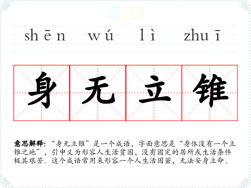 “身无立锥”是一个成语,字面意思是“身体没有一个立锥之地”,引申义为形容人生活贫困,没有固定的居所或生活条件极其艰苦。这个成语常用来形容一个人生活困窘,无法安身立命。