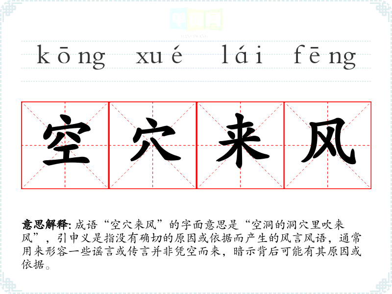 成语“空穴来风”的字面意思是“空洞的洞穴里吹来风”,引申义是指没有确切的原因或依据而产生的风言风语,通常用来形容一些谣言或传言并非凭空而来,暗示背后可能有其原因或依据。