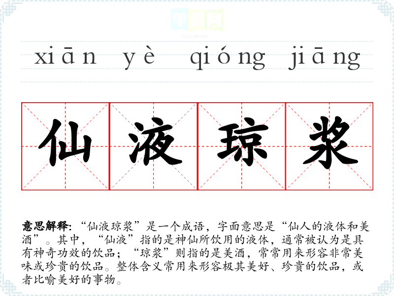 “仙液琼浆”是一个成语,字面意思是“仙人的液体和美酒”。其中,“仙液”指的是神仙所饮用的液体,通常被认为是具有神奇功效的饮品;“琼浆”则指的是美酒,常常用来形容非常美味或珍贵的饮品。整体含义常用来形容极其美好、珍贵的饮品,或者比喻美好的事物。