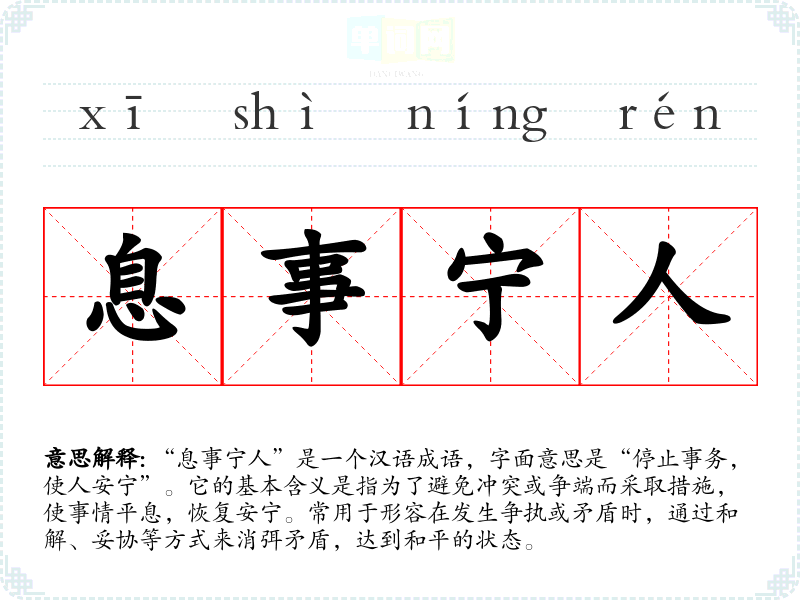“息事宁人”是一个汉语成语,字面意思是“停止事务,使人安宁”。它的基本含义是指为了避免冲突或争端而采取措施,使事情平息,恢复安宁。常用于形容在发生争执或矛盾时,通过和解、妥协等方式来消弭矛盾,达到和平的状态。