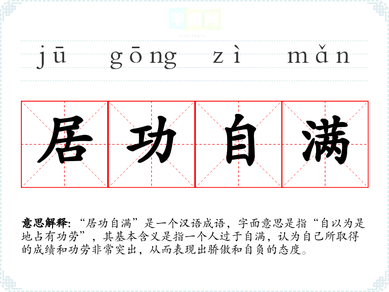 “居功自满”是一个汉语成语,字面意思是指“自以为是地占有功劳”,其基本含义是指一个人过于自满,认为自己所取得的成绩和功劳非常突出,从而表现出骄傲和自负的态度。