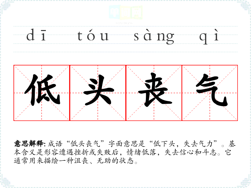 成语“低头丧气”字面意思是“低下头,失去气力”。基本含义是形容遭遇挫折或失败后,情绪低落,失去信心和斗志。它通常用来描绘一种沮丧、无助的状态。