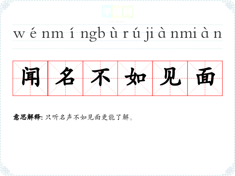 | 闻名不如见面 | 只听名声不如见面更能了解。 |