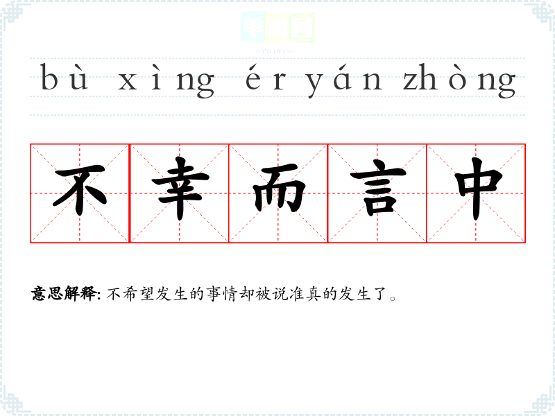 | 不幸而言中 | 不希望发生的事情却被说准真的发生了。 |