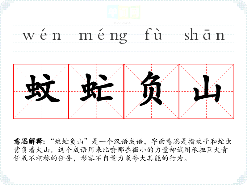 | 蚊思负山 | 负:担负。比喻力量虽微却愿担负重任。 |