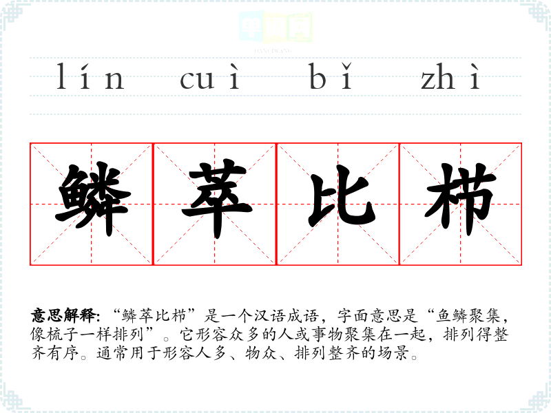 该成语出自《左传》,原句为“鳞萃比栉”,描述的是古代的战斗场景。在春秋时期,战斗时士兵们像鱼鳞一样聚集,或如梳子般整齐排列,显示出整齐划一的作战阵势。这个成语因此带有一种军事组织严密的意味。