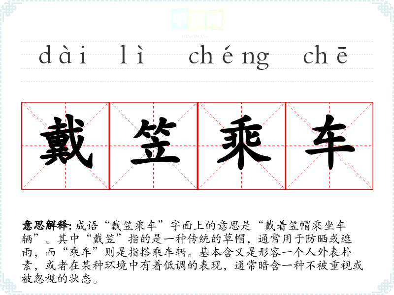 成语“戴笠乘车”字面上的意思是“戴着笠帽乘坐车辆”。其中“戴笠”指的是一种传统的草帽,通常用于防晒或遮雨,而“乘车”则是指搭乘车辆。基本含义是形容一个人外表朴素,或者在某种环境中有着低调的表现,通常暗含一种不被重视或被忽视的状态。
