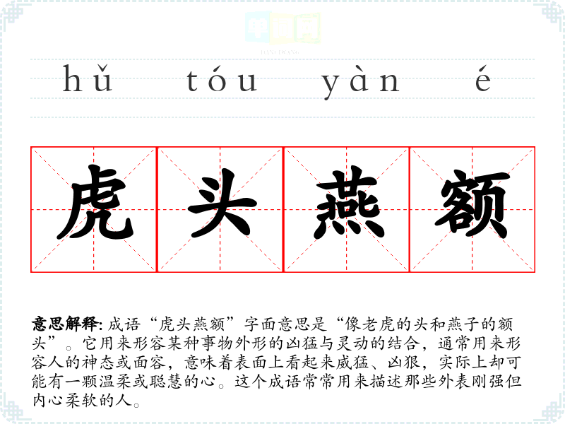 成语“虎头燕额”字面意思是“像**的头和燕子的额头”。它用来形容某种事物外形的凶猛与灵动的结合,通常用来形容人的神态或面容,意味着表面上看起来威猛、凶狠,实际上却可能有一颗温柔或聪慧的心。这个成语常常用来描述那些外表刚强但内心柔软的人。