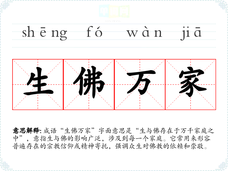 成语“生佛万家”字面意思是“生与佛存在于万千家庭之中”,意指生与佛的影响广泛,涉及到每一个家庭。它常用来形容普遍存在的信仰或精神寄托,强调众生对的依赖和崇敬。