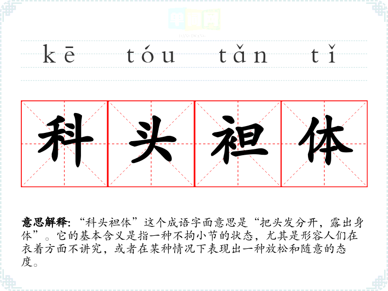 “科头袒体”这个成语字面意思是“把头发分开,露出身体”。它的基本含义是指一种不拘小节的状态,尤其是形容人们在衣着方面不讲究,或者在某种情况下表现出一种放松和随意的态度。