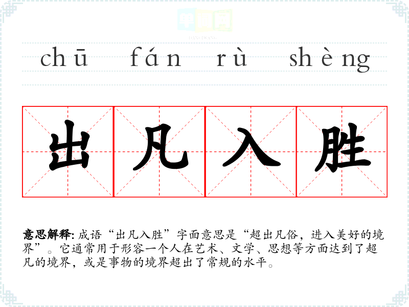 成语“出凡入胜”字面意思是“超出凡俗,进入美好的境界”。它通常用于形容一个人在艺术、文学、思想等方面达到了超凡的境界,或是事物的境界超出了常规的水平。