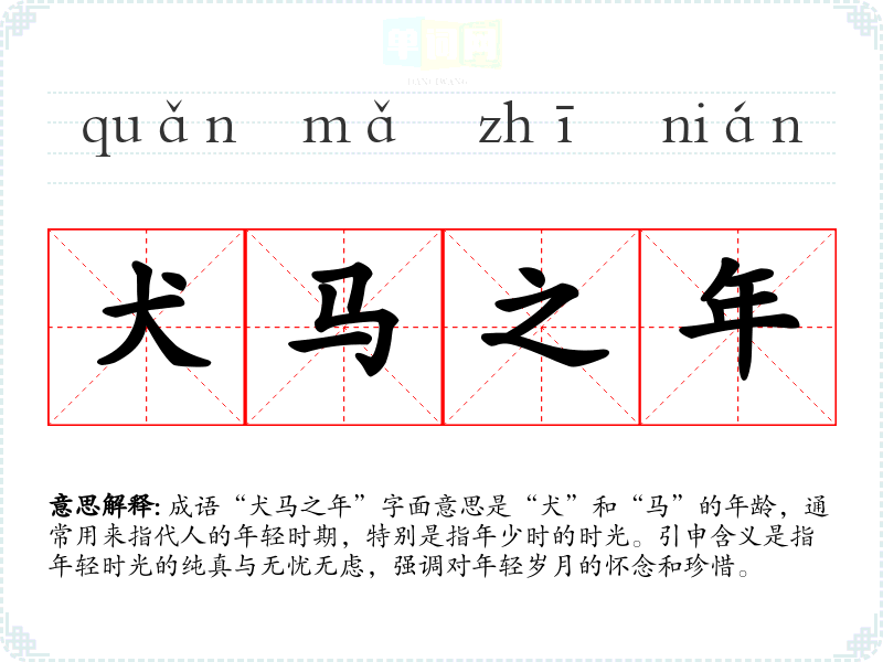 成语“犬马之年”字面意思是“犬”和“马”的年龄,通常用来指代人的年轻时期,特别是指年少时的时光。引申含义是指年轻时光的纯真与无忧无虑,强调对年轻岁月的怀念和珍惜。