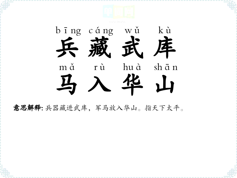 | 刀枪入库 | 没有战争,不用武备;和平麻痹,解除武装,不作戒备。 |