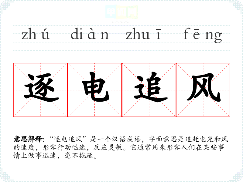 “逐电追风”给人一种积极向上的感觉,联想到快速、高效、果断等积极的品质。它提醒我们在面对任务时,应该保持敏捷的思维和迅速的行动。