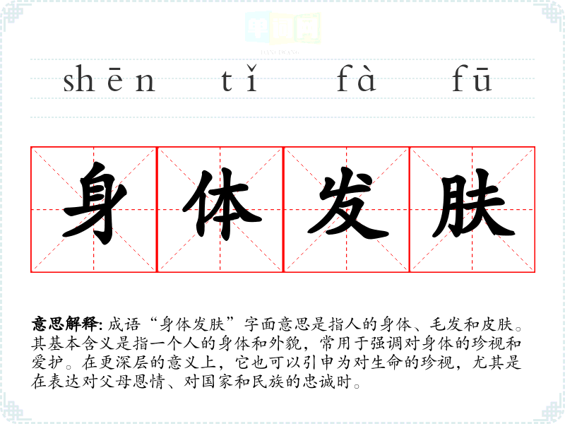 成语“身体发肤”字面意思是指人的身体、毛发和皮肤。其基本含义是指一个人的身体和外貌,常用于强调对身体的珍视和爱护。在更深层的意义上,它也可以引申为对生命的珍视,尤其是在表达对父母恩情、对国家和民族的忠诚时。