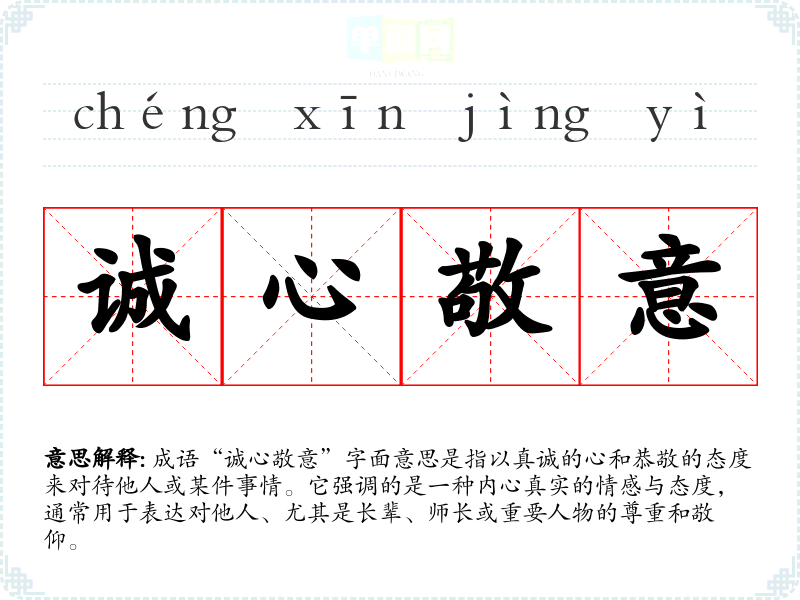 成语“诚心敬意”字面意思是指以真诚的心和恭敬的态度来对待他人或某件事情。它强调的是一种内心真实的情感与态度,通常用于表达对他人、尤其是长辈、师长或重要人物的尊重和敬仰。