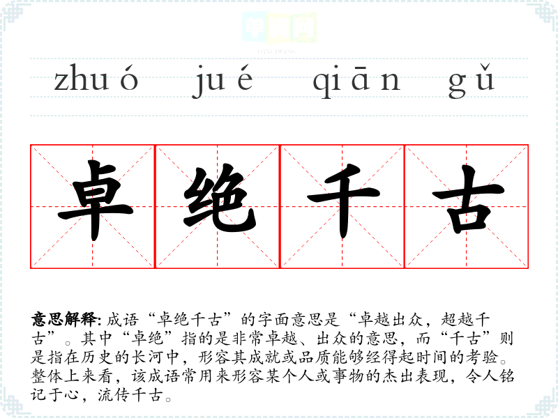 | 卓绝千古 | 卓绝:程度达到极点,超过一切。超过以往的一切人。 |