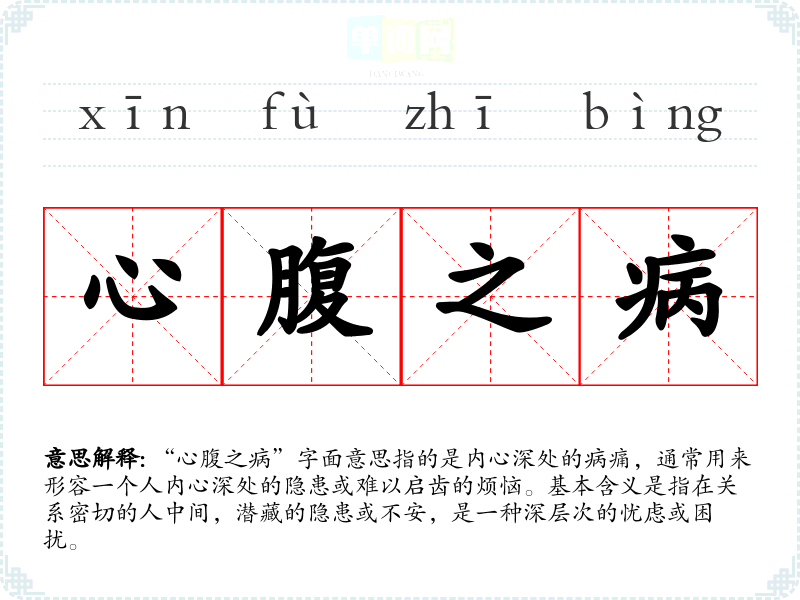 “心腹之病”字面意思指的是内心深处的病痛,通常用来形容一个人内心深处的隐患或难以启齿的烦恼。基本含义是指在关系密切的人中间,潜藏的隐患或不安,是一种深层次的忧虑或困扰。