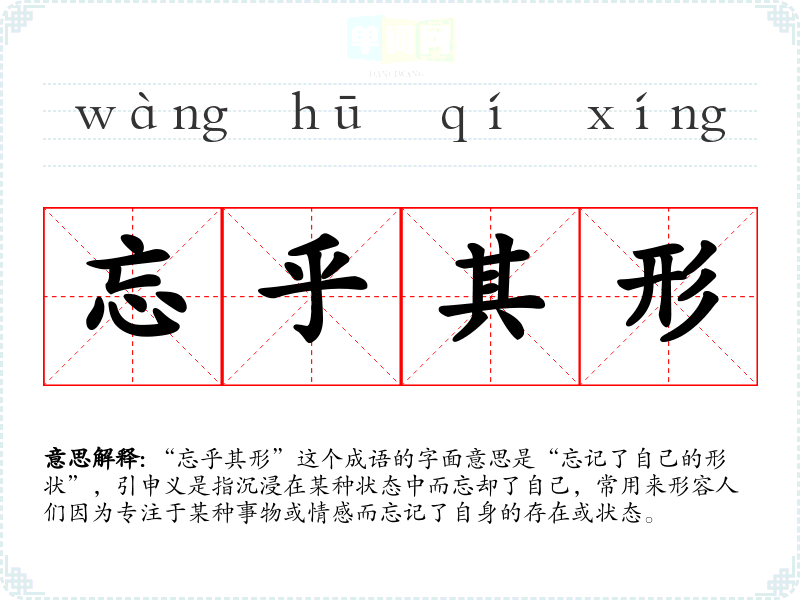 “忘乎其形”这个成语的字面意思是“忘记了自己的形状”,引申义是指沉浸在某种状态中而忘却了自己,常用来形容人们因为专注于某种事物或情感而忘记了自身的存在或状态。