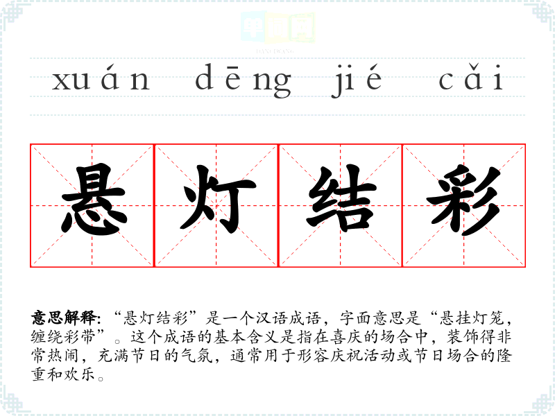 “悬灯结彩”是一个汉语成语,字面意思是“悬挂灯笼,缠绕彩带”。这个成语的基本含义是指在喜庆的场合中,装饰得非常热闹,充满节日的气氛,通常用于形容庆祝活动或节日场合的隆重和欢乐。