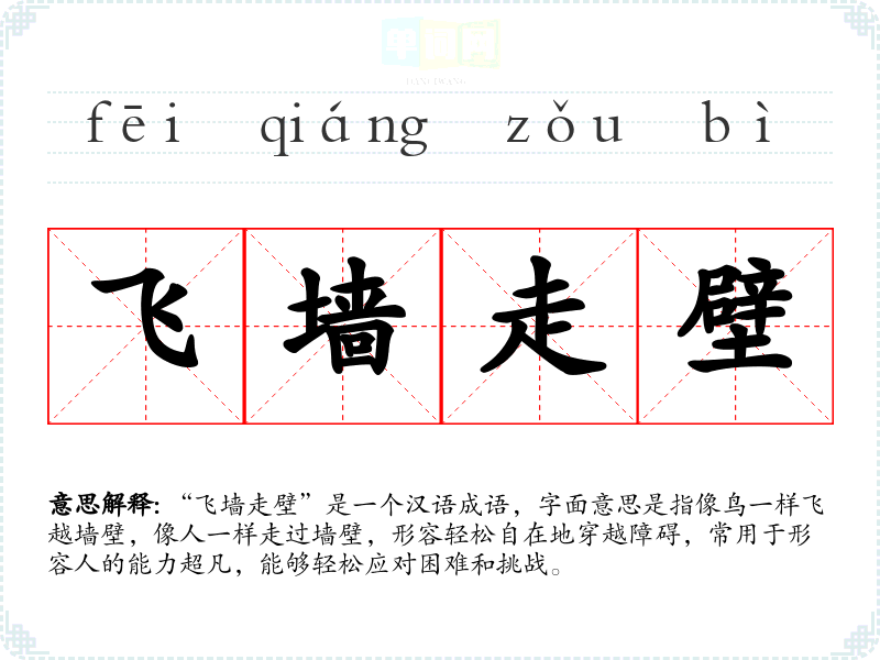 “飞墙走壁”是一个汉语成语,字面意思是指像鸟一样飞越墙壁,像人一样走过墙壁,形容轻松自在地穿越障碍,常用于形容人的能力超凡,能够轻松应对困难和挑战。