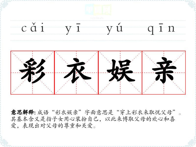 成语“彩衣娱亲”字面意思是“穿上彩衣来取悦父母”。其基本含义是指子女用心装扮自己,以此来博取父母的欢心和喜爱,表现出对父母的尊重和关爱。