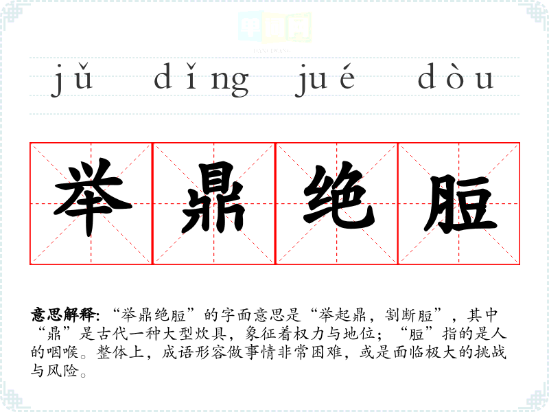 “举鼎绝脰”的字面意思是“举起鼎,割断脰”,其中“鼎”是古代一种大型炊具,象征着权力与地位;“脰”指的是人的咽喉。整体上,成语形容做事情非常困难,或是面临极大的挑战与风险。