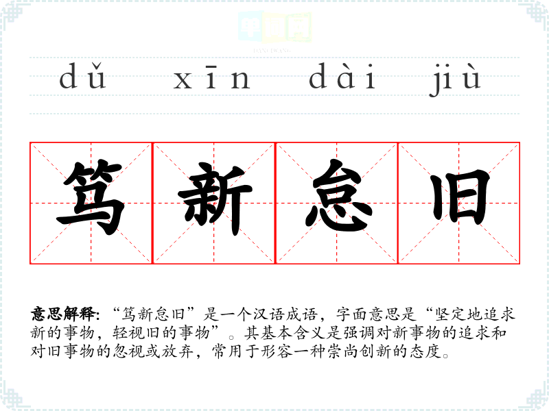 “笃新怠旧”是一个汉语成语,字面意思是“坚定地追求新的事物,轻视旧的事物”。其基本含义是强调对新事物的追求和对旧事物的忽视或放弃,常用于形容一种崇尚创新的态度。