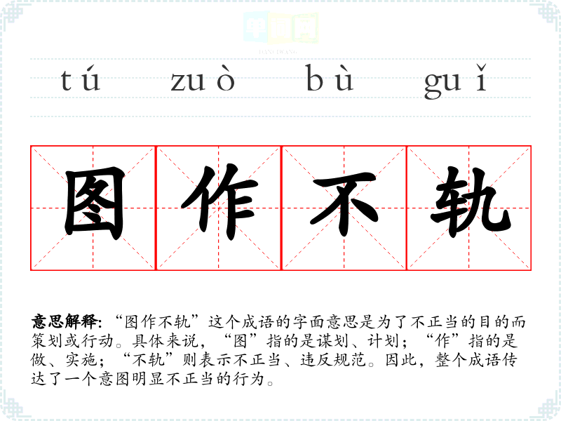 “图作不轨”这个成语的字面意思是为了不正当的目的而策划或行动。具体来说,“图”指的是谋划、计划;“作”指的是做、实施;“不轨”则表示不正当、违反规范。因此,整个成语传达了一个意图明显不正当的行为。