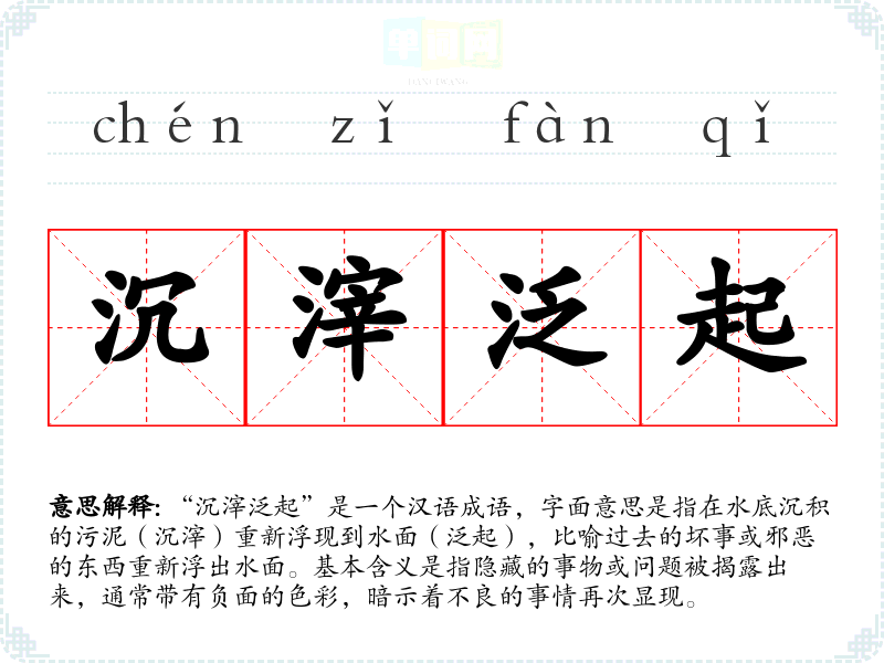 “沉滓泛起”是一个汉语成语,字面意思是指在水底沉积的污泥(沉滓)重新浮现到水面(泛起),比喻过去的坏事或邪恶的东西重新浮出水面。基本含义是指隐藏的事物或问题被揭露出来,通常带有负面的色彩,暗示着不良的事情再次显现。