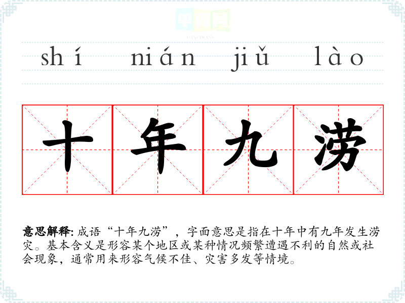 成语“十年九涝”,字面意思是指在十年中有九年发生涝灾。基本含义是形容某个地区或某种情况频繁遭遇不利的自然或社会现象,通常用来形容气候不佳、灾害多发等情境。