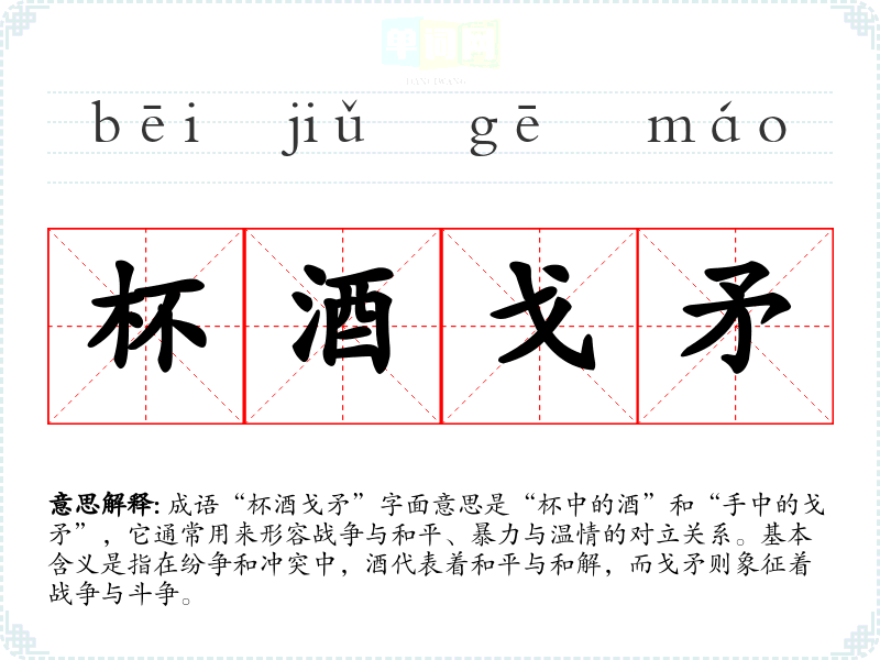 成语“杯酒戈矛”字面意思是“杯中的酒”和“手中的戈矛”,它通常用来形容战争与和平、暴力与温情的对立关系。基本含义是指在纷争和冲突中,酒代表着和平与和解,而戈矛则象征着战争与斗争。