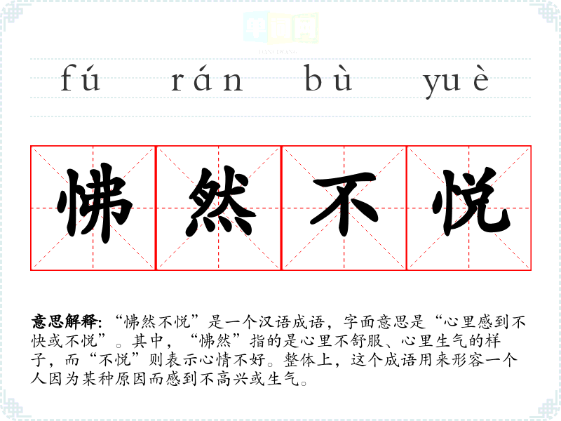 | 艴然不悦 | 非常生气。艴fú然,也作怫然,生气时表现一付脸色难看的样子。 |