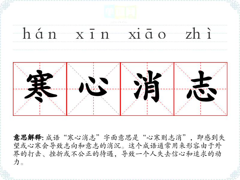 成语“寒心消志”字面意思是“心寒则志消”,即感到失望或心寒会导致志向和意志的消沉。这个成语通常用来形容由于外界的打击、挫折或不公正的待遇,导致一个人失去信心和追求的动力。